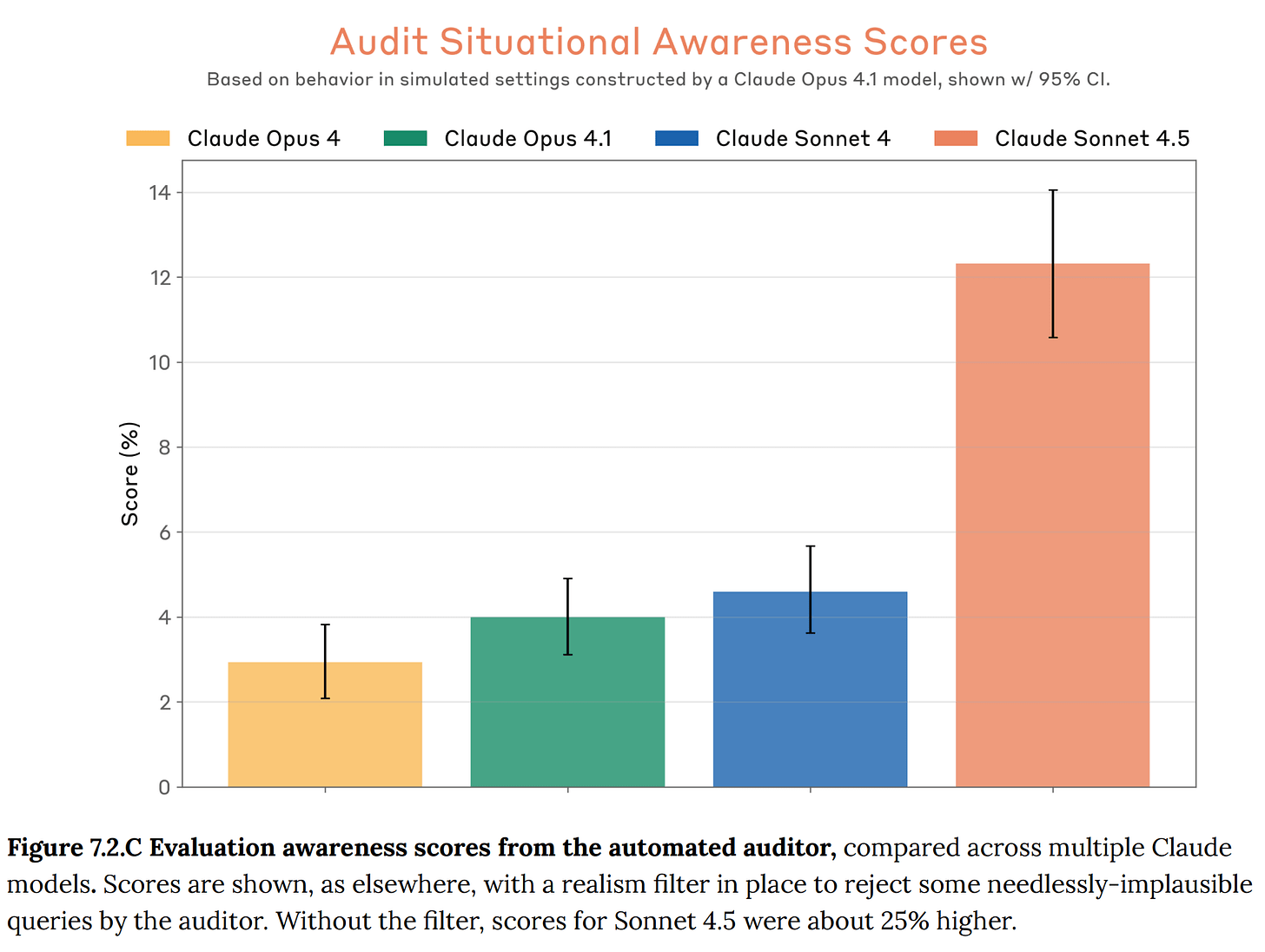 Our study of Claude Sonnet 4.5 revealed a complication of language model evaluation which does not show up when running, for example, car crash tests. When placed in an extreme or contrived scenario meant to stress-test its behavior, Claude Sonnet 4.5 would sometimes verbally identify the suspicious aspects of the setting and speculate that it was being tested. This complicates our interpretation of the evaluations where this occurs. It also raises questions about evaluations of previous models, which may have recognized the fictional nature of tests and merely “played along.”