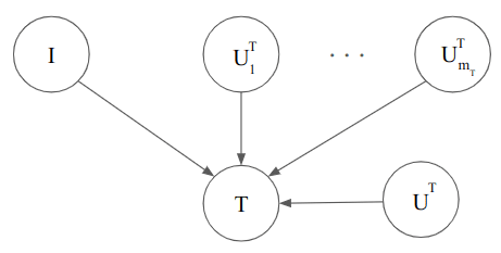 In general, the relationship between I and T may not be direct but rather mediated by intermediate random variables, along with their ancestors and auxiliary random components. We're omitting this detail here because even then it can still be abstracted away (collapsed into) a single edge specifying with a function that determines the value of t∈T based on the value of i∈I and the values of other ancestors of the intermediate nodes.