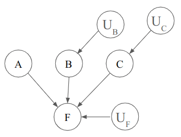 A causal diagram (CD) is a special kind of directed acyclic graph (DAG). Its nodes represent random variables and its edges represent causal relationships between the random variables. The existence of an edge Xe→Y means "the value of X (co-)determines the value of Y. The value of the random variable Y is fully determined by a function fY:(X1×⋯×Xn×UY)→Y where X1 through Xn are the parents of Y and UY is its random auxiliary variable, representing a random component of Y ("U" for "unknown"). In other words, the value y∈Y is determined by a function y=f(x1,...,xn,u) with u∼UY (slight abuse of notation: we use UY to denote both the random variable and its distribution).