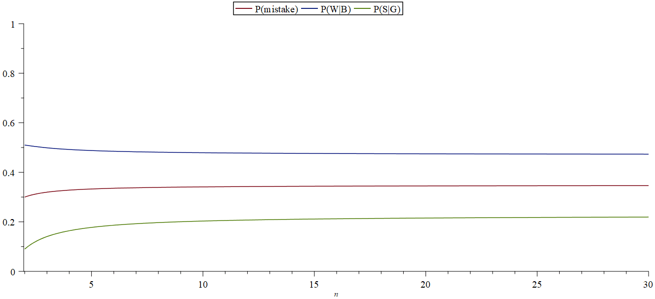 Finding is just a matter of plugging in values for , , and .[10] For instance, if 15 agents all have a probability threshold of 50% and their impressions are 75% accurate, then the chance of any individual with a positive impression writing the paper is .