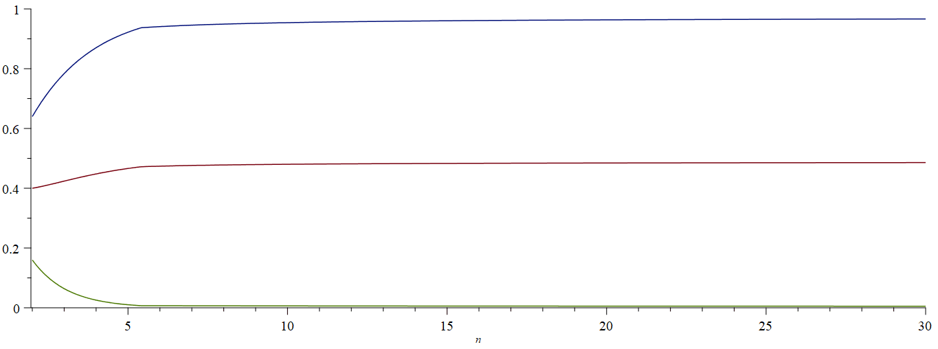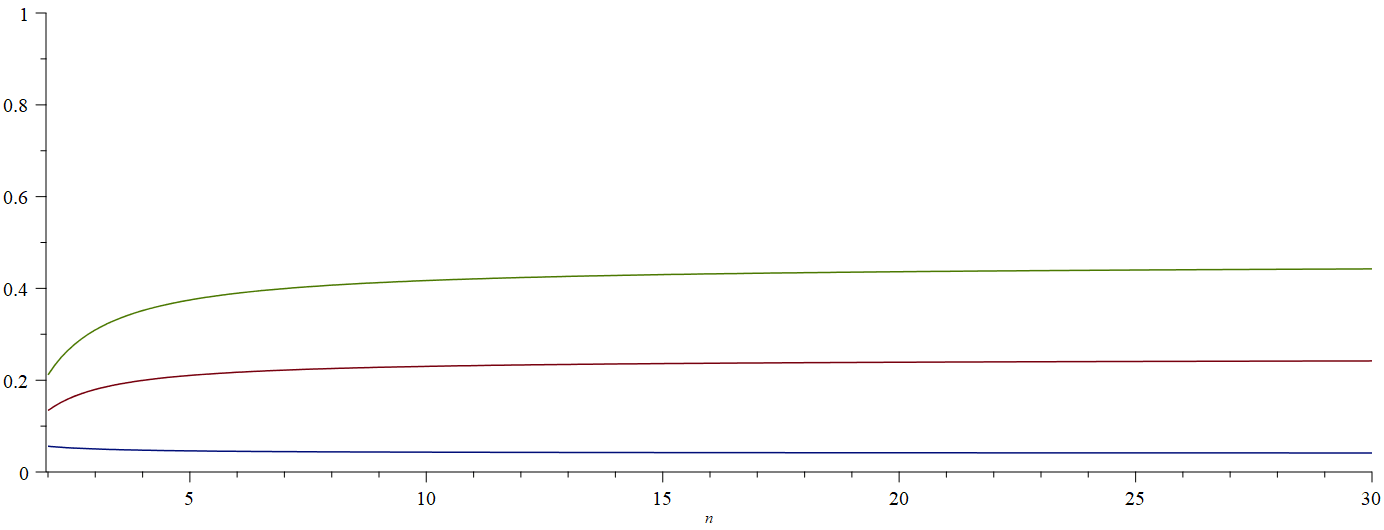 In the graphs below, notice (i) that the risks can rise or fall with , (ii) how much they differ based on the other parameters, and (iii) how fast they converge to their limits.[15]