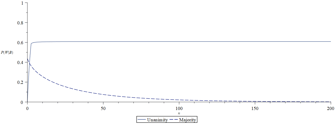 The framework is somewhat different from that in Bostrom et al (2016) but more in line with Feddersen and Pesendorfer (1998). This doesn’t meaningfully affect the conclusions.