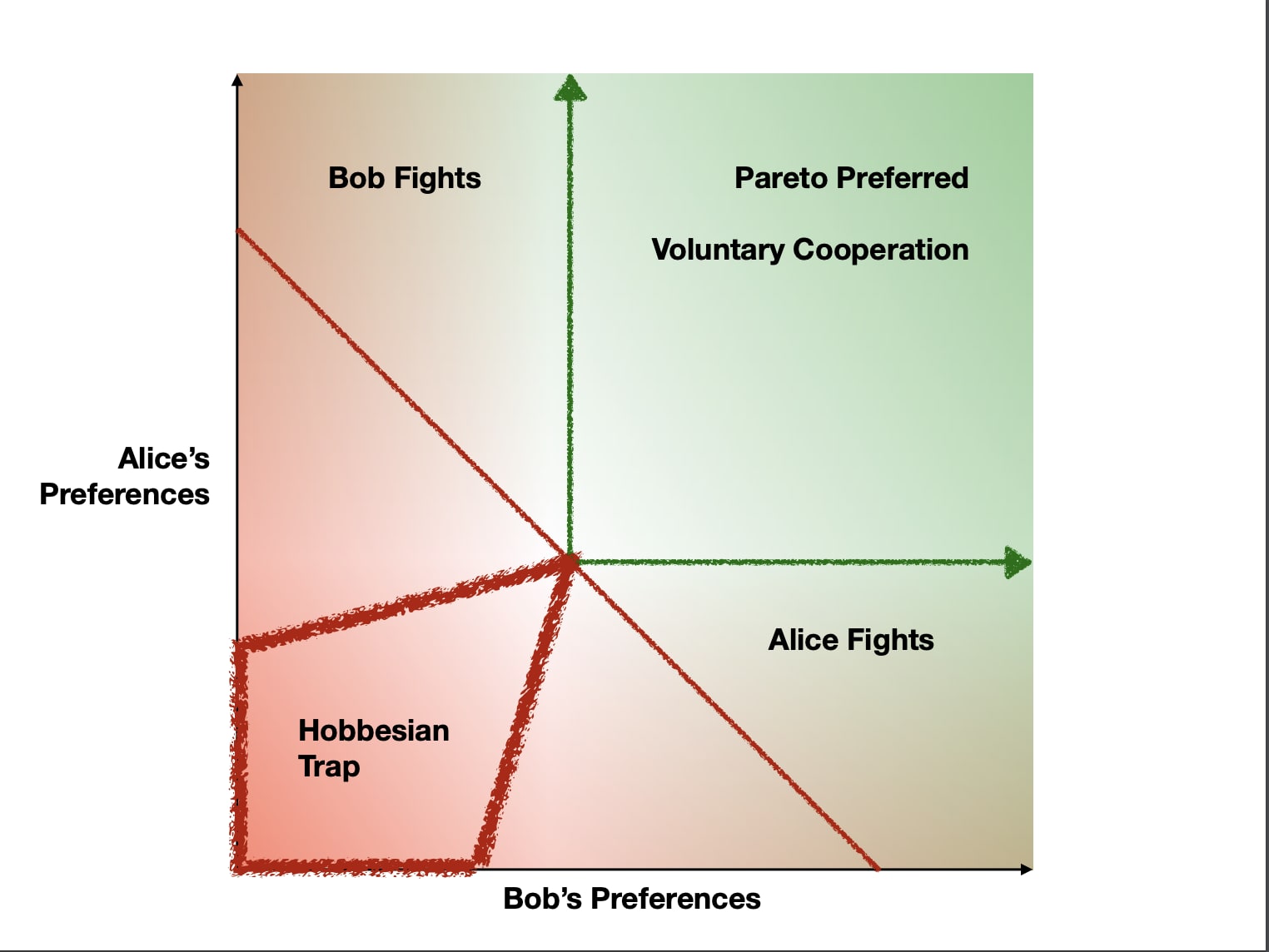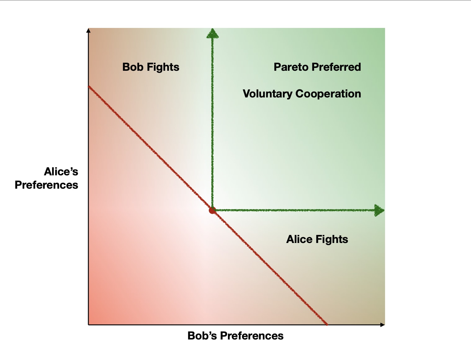 There is a problem with simply seeking positive sum outcomes. If Bob would be worse off than he currently is, he would fight any attempt to get there. Likewise, Alice would fight the positive sum outcomes she likes less than the status quo. But if Alice and Bob are either equally or better off than they currently are, both have good reason to cooperate. Together, they can move to Pareto-preferred worlds. Situation B is Pareto-preferred to situation A if anyone prefers B to A, and no one prefers A to B. Those worlds can be reached by voluntary cooperation.