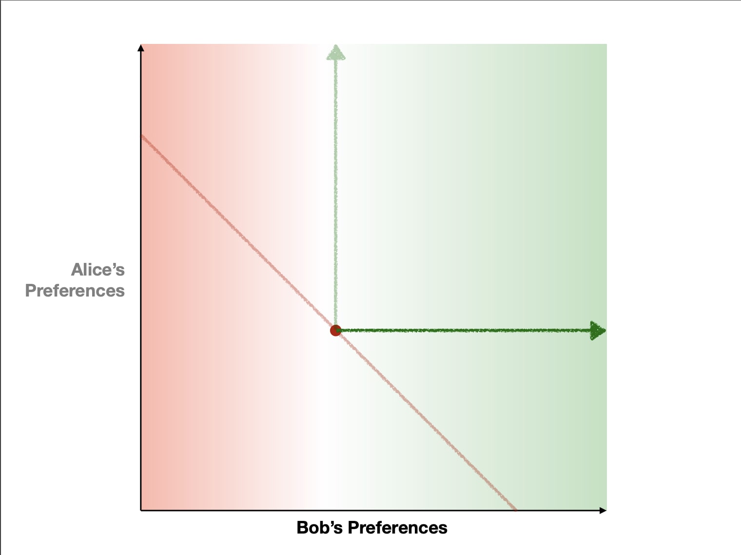 Imagine a game of civilization played by Alice and Bob. A world in which different players have different goals can be described in terms of preferences among future states. The center dot is the current state of the world that players Alice and Bob are in. The axes are the world states, organized by Alice's preferences vertically and by Bob's preferences horizontally. Bob prefers the green worlds to the current world.