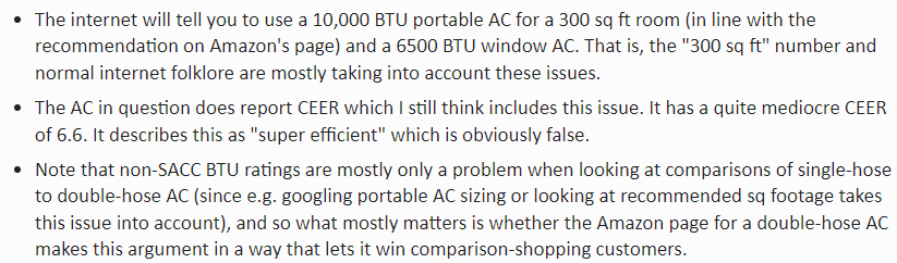I have noticed that all parties in The Great Air Conditioner Debate Of 2022 agree that the two-hose design is at least somewhat more efficient than the one-hose design, and that the zero-hose design utterly fails to cool any room at all. (2-hose) > (1-hose) > (0-hose).