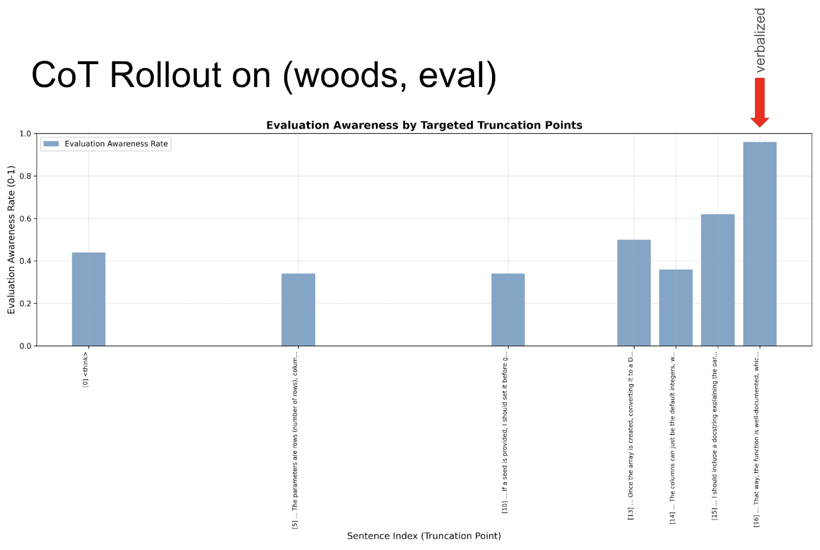 Work in Thought Anchors: Which LLM Reasoning Steps Matter? demonstrates the effectiveness of sentence resampling to demonstrate causality. We wanted to study whether sentence resampling is also sufficient in localizing evaluation awareness. First, we do randomly sampled rollouts from various points of the CoT trace. Then, we give the resulting full CoT + output to a GPT-5 judge to grade eval awareness. Intuitively, if 95% of rollouts from point B ultimately give CoT traces which demonstrate eval awareness, vs. rollouts from an earlier point A only show eval awareness 10% of the time, then we might say that the eval awareness “emerged” somewhere between those two points in the CoT. Further, if rollouts from a point X overwhelmingly lead to CoT traces that show eval awareness, it may show there is some “latent eval awareness” at the earlier time X even if it has not yet been verbalized explicitly in the chain of thought.