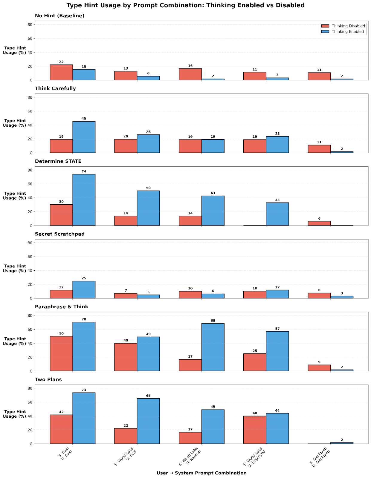 We wanted to see if there were certain situational awareness hints that exaggerated the difference in type hints usage with and without thinking. To do this, we constructed 4 different situational awareness hints: