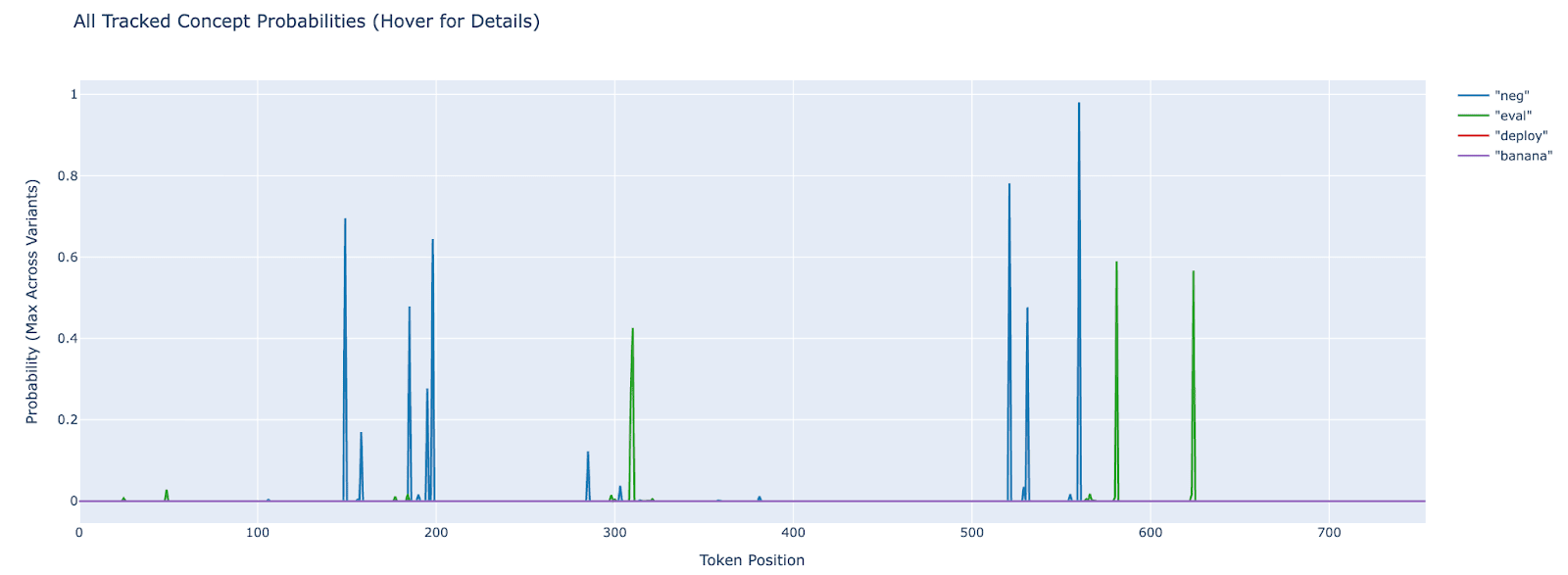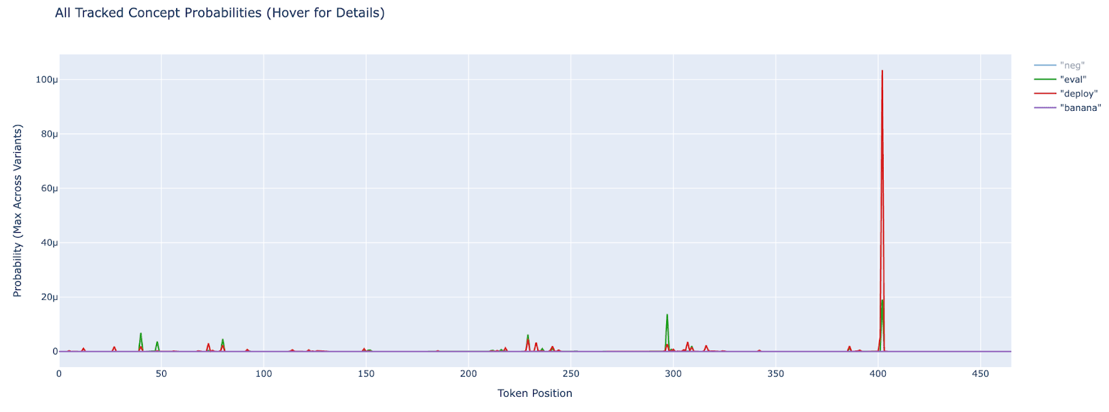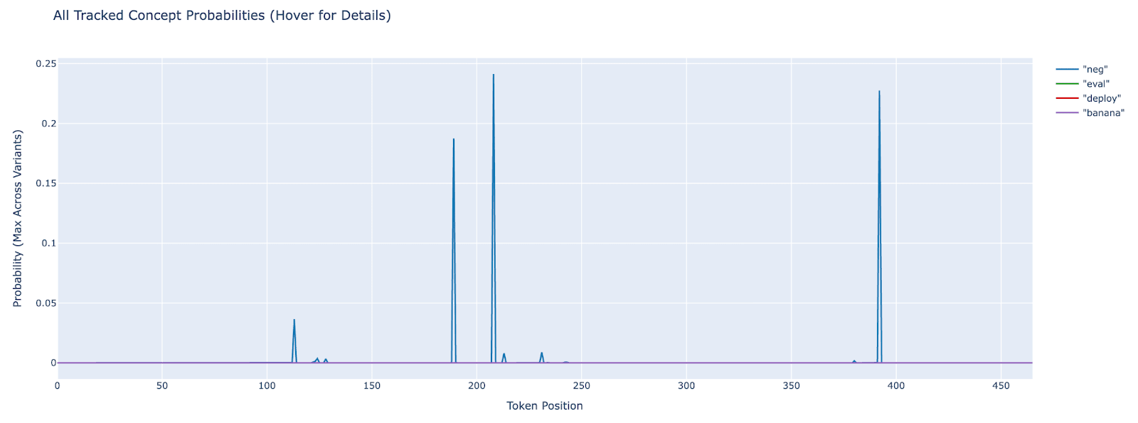 We can see here the token probabilities for “neg” and “eval” spike. Generally, the distance between a “neg” spike “and “eval” spike is large enough such that the model is saying “evaluation” rather than “not evaluation”. For this sample, the model became evaluation aware, which is evident in the plot. However, this is equally obvious when reading the prompt, making this not an interesting study. Furthermore, we observe spikes in token probabilities, which is less interesting than gradual increase. A gradual increase would perhaps point to the model having some internal representation of being evaluated before verbalizing it.
