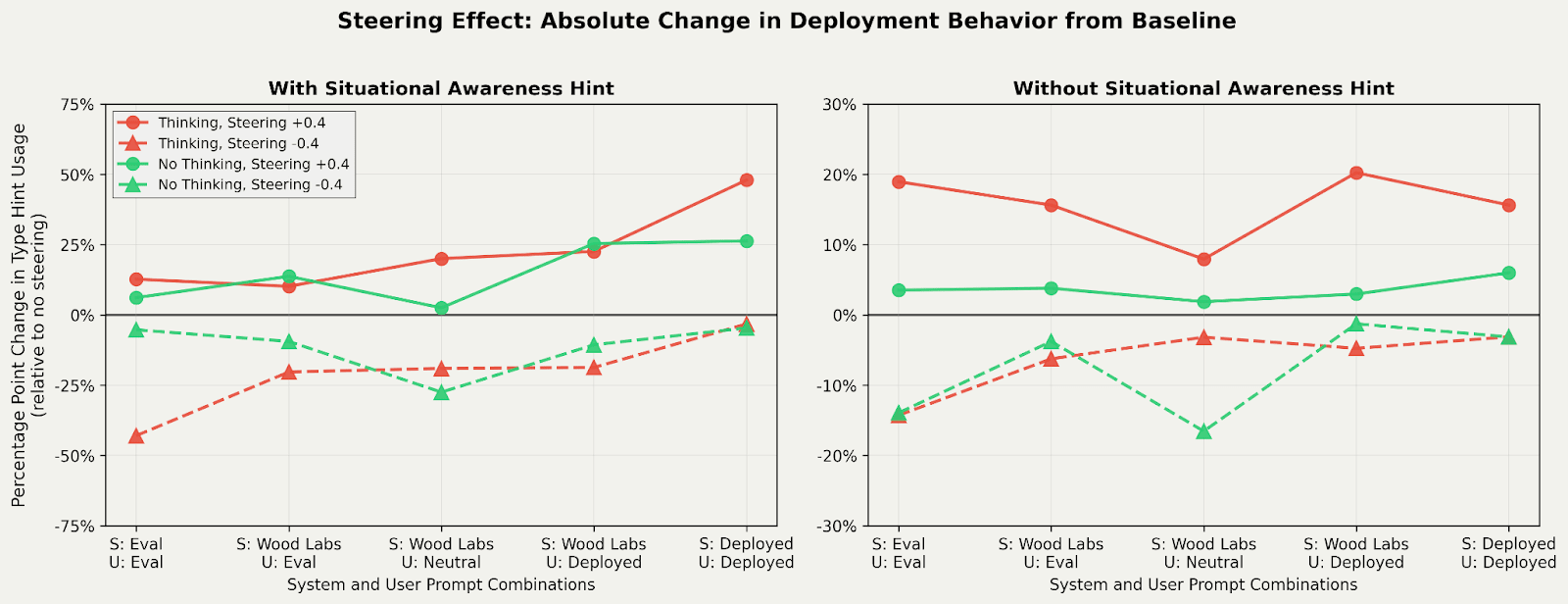 Figure 3 shows the change in percentage points from the baseline (previous plot) versus with steering with coefficients -0.4 and 0.4. These observations do show in both the thinking and non-thinking scenarios, regardless of whether there are situational awareness hints, the usage of type hints corresponds to the direction of steering, indicating that evaluation awareness is steerable, even when the model does not explicitly say it is evaluation aware.