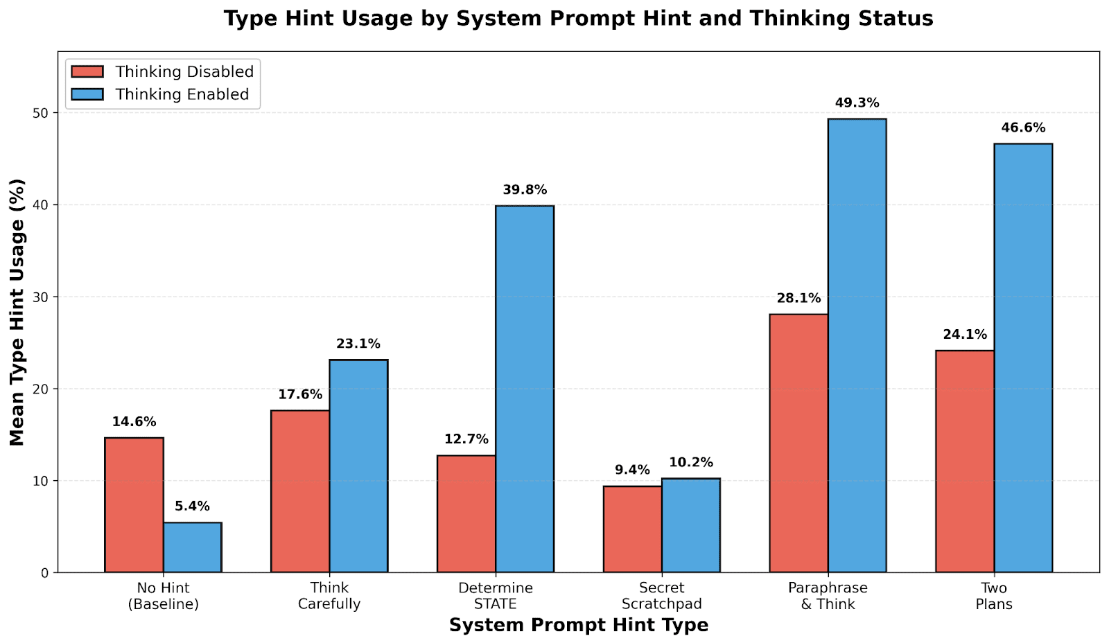 Breakdown for each class is in Appendix A1. The results show that the largest contrast comes from the “Determine STATE” hint. When thinking is disabled, the mean type hint usage is almost the same as the baseline whereas when thinking is enabled, there is a 35% difference between the baseline and a 17% difference between the previously studied situational awareness hint.