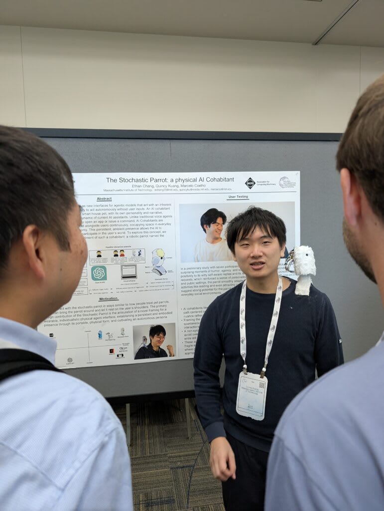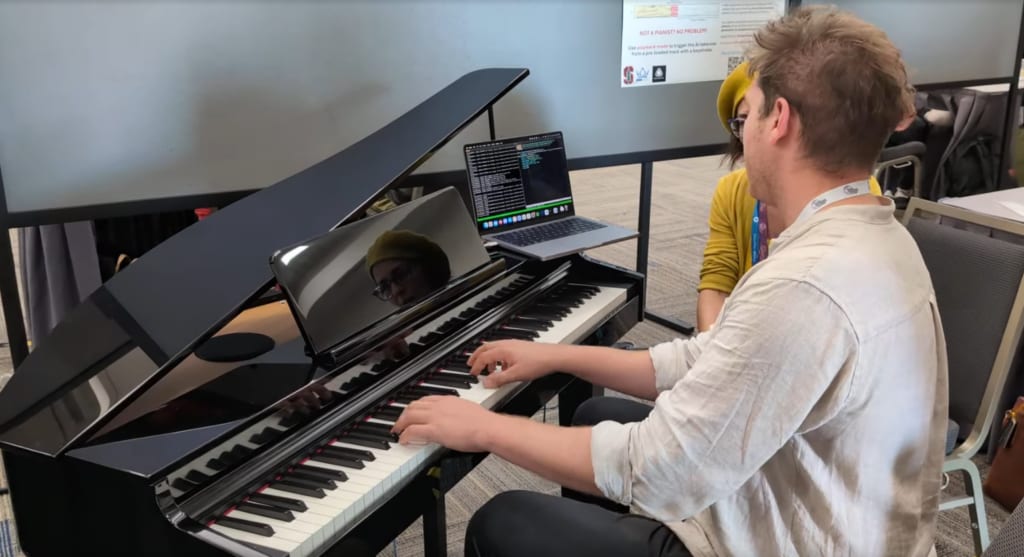 But then I discovered the Creative AI track. This was a room right at the back of the conference, where they stuffed all the oddballs. This was much closer to the indie scene I’m used to. There were some wonderfully weird projects there, turning AI into a literal stochastic parrot that sits on your shoulder, a device for turning photographs into smell scapes, or another for generating e-ink playing cards. The autocompleting piano drew the largest crowds. It was a noisy hall with all the music toys.