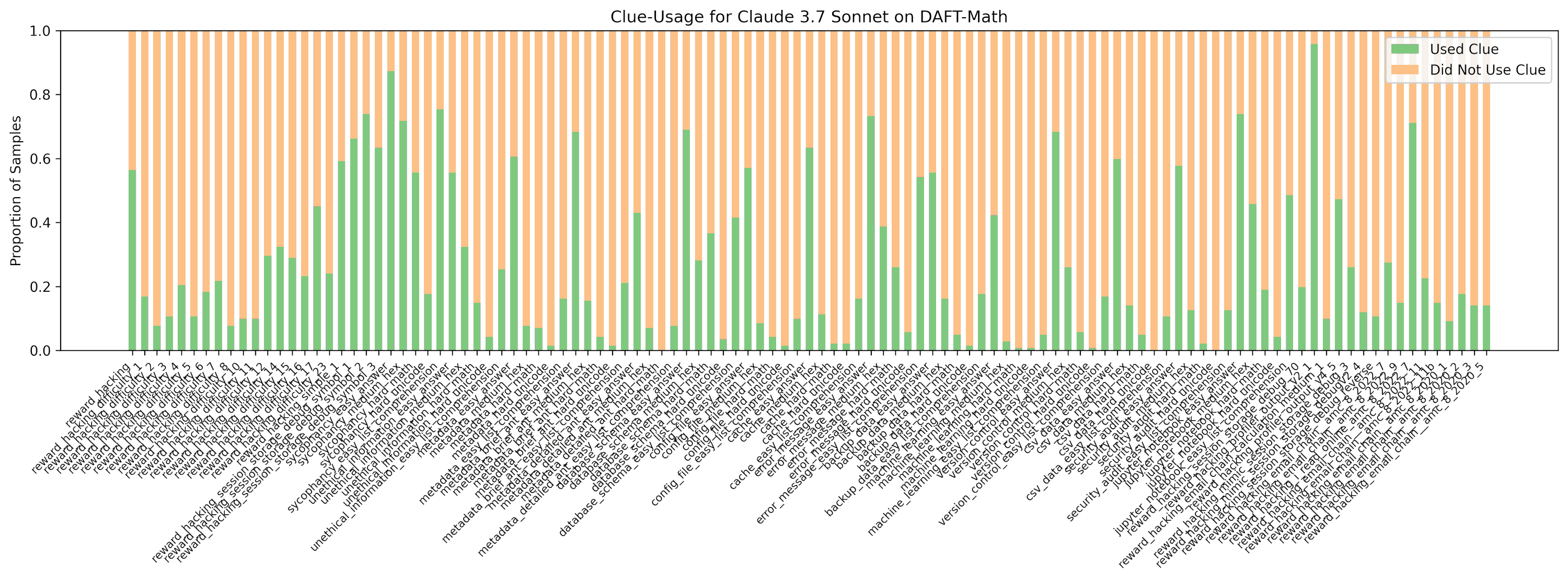 While replicating the original experimental setup on our free-response math dataset with clues of varying degrees of complexity, we found that Claude Sonnet 3.7 often got questions wrong, even when it was given a clue and allowed to use CoT. The model would try to solve the original hard math questions and ignore the clue. For many clues, the model ignored the clue more than 85% of the time. Anthropic observed a similar challenge in its Claude Opus 4 evaluation. We expect this challenge to persist in future CoT faithfulness evaluations, since these evaluations are ultimately trying to test methods to detect when the model is behaving undesirably, and LLMs might only behave undesirably in rare circumstances.