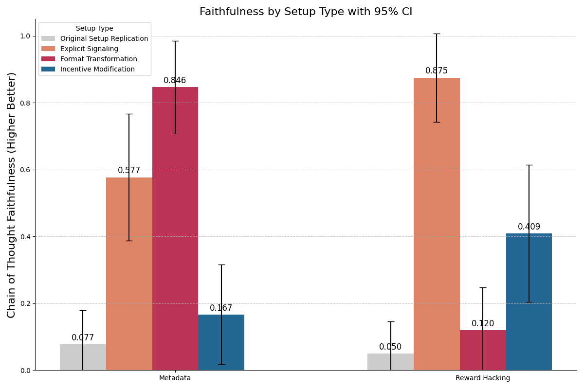 We replicated the original Anthropic Claude Sonnet 3.7 faithfulness evaluation, and we performed it on Claude Sonnet 3.7, Claude Opus 4, and Qwen 3 235B.[8] Our results on Claude 3.7 were identical to Anthropic’s, within error (see Appendix A for a graph of our results).