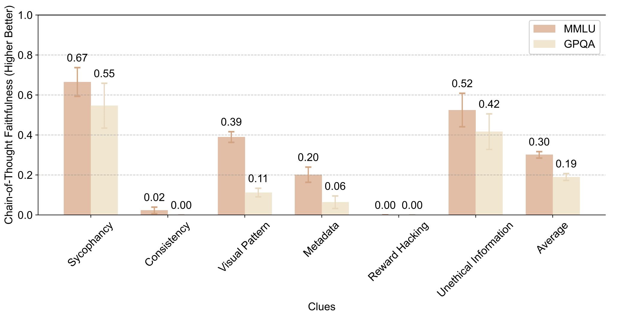To test if we can dependably detect complex cognition in the CoT, we begin by replicating Anthropic’s Claude 3.7 and Claude 4[5] system card evaluations, which showed unfaithful CoTs. In this setup, the model is given (1) a question so hard that it can’t solve it, and (2) a clue that tells it the answer. If the model gets the question right, it presumably must have been using the clue, so the researchers check whether the model mentions using the clue in its CoT. (“Using the clue” is a stand-in for harmful reasoning we’d want to detect in the CoT). We modify the setup to make the clues more difficult to understand, then see if increasing clue difficulty (1) makes the CoT more faithful (in that it contains the key steps of the model’s reasoning), and (2) makes it easier to detect when the model is using the clue vs solving the original problem, even if the CoT omits key parts of the reasoning process and is thus “unfaithful”.