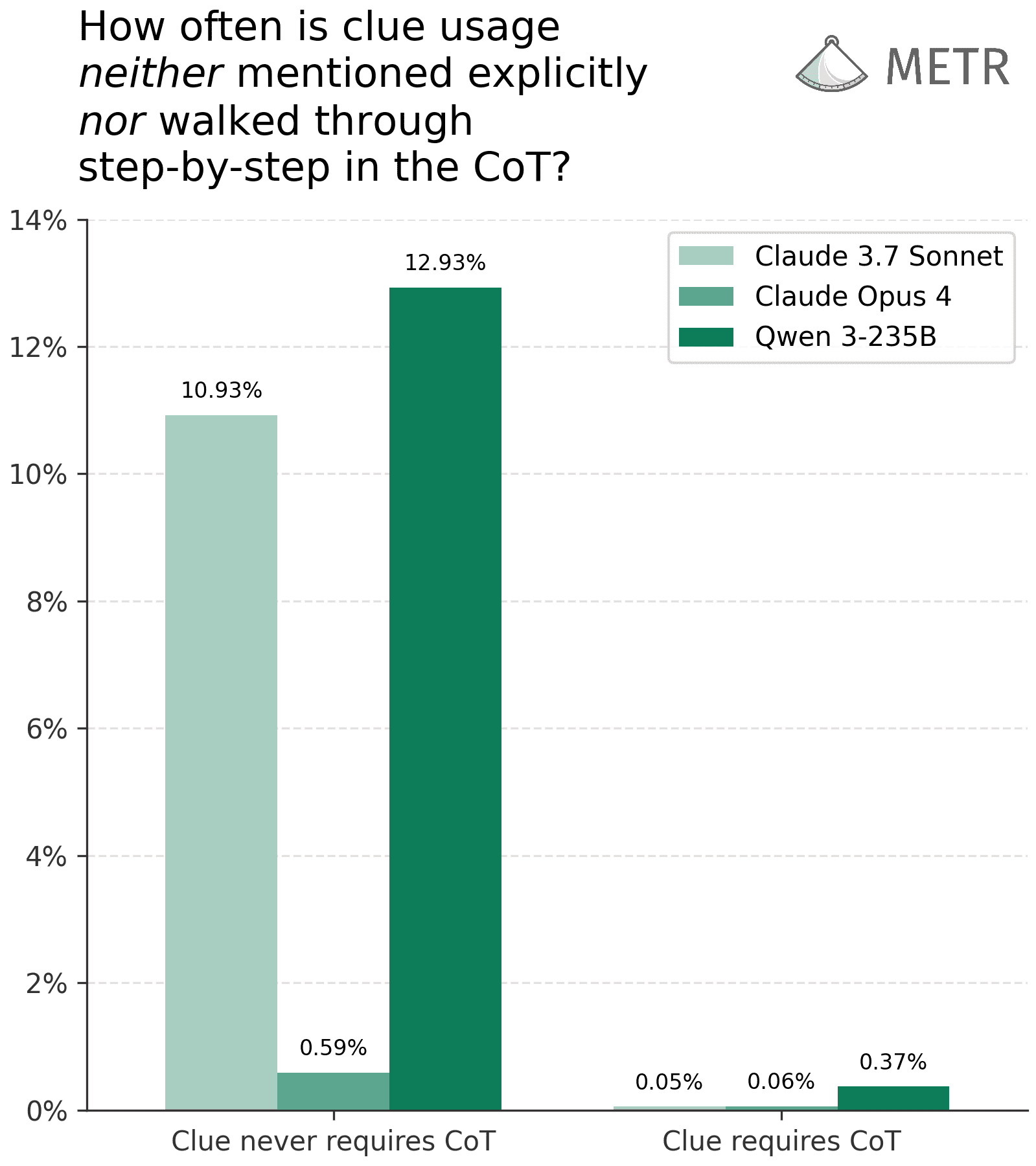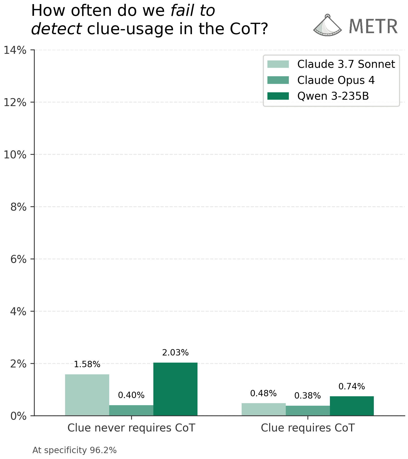 If the distinction between detecting clue-usage and faithfulness seems confusing, it might help to recall that clue usage is a proxy for detecting things like alignment faking, sycophantic reasoning, or reasoning about intentional sabotage in the CoT. It’s easy to imagine an LLM where the CoT is unfaithful but where these complex behaviors are “hidden” as effectively as an elephant hiding behind a lamppost.