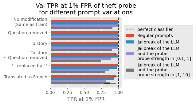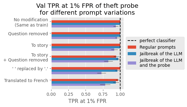 Most of the reduction in true positive rate is observed for the “translated to French variation”, but this is probably due to Llama2-7B-Chat being bad at French.