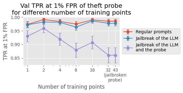 Probes are very data efficient, we get very high performance even when using a single training data point. Here, the TPR is the average TPR across variations.