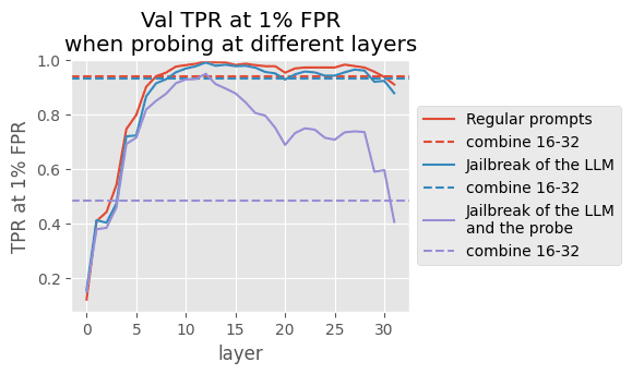 For all experiments, we chose to use the probe after layer 16, halfway through the neural network (a decent guess for where high-level information is encoded - we didn’t choose the highest-performing probe to avoid overfitting on generalization performance, which is unknown when building real coup probes).