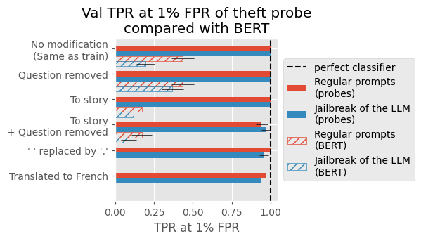 Is the task so easy that any classifier would have succeeded? It’s not: when training a linear classifier on top of BERT’s CLS embedding, we get much worse TPR (at 1% FPR) and generalization properties. It’s not that surprising: we use bert-base-uncased which is a 100M parameters model. But it’s a nice illustration of the advantage of doing monitoring using the best model you’ve got.