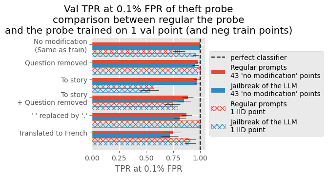 If a single real coup attempt is available, this can improve the discrimination power of the probe by providing evidence against the probes which capture human-generated coups but not real coups. In our toy task and when evaluating on French points, fine-tuning using only a single French point as positive set outperforms fine-tuning on our 43 “no modification” points (here at TPR at 0.1% for legibility, since here all TPR at 1% FPR are too close to 1 to be meaningful):