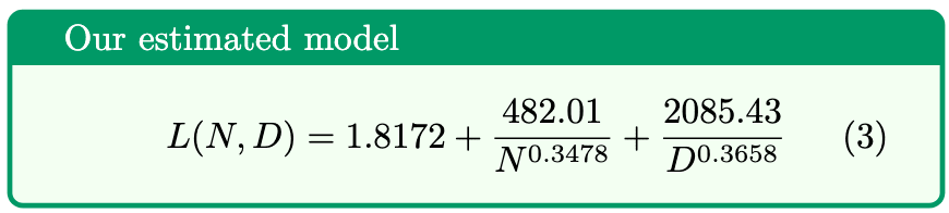 L is the pre-training loss, N is the number of parameters, and D is the dataset size. This is the compute optimal scaling law. That is, if you used a fixed amount of compute optimally, this is how N and D contribute to the loss. Where compute is roughly 6*N*D.