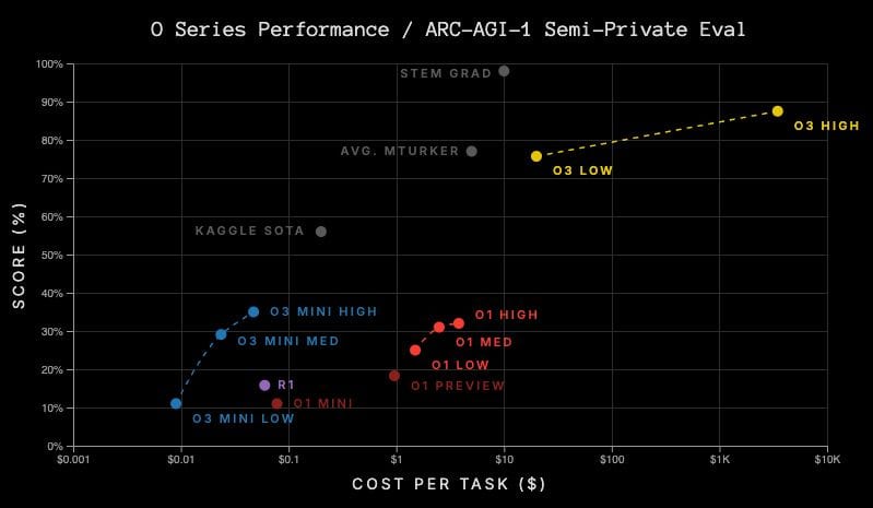 In fact, Gwern doesn’t think OpenAI has solved AGI, or that they’re close. The data seem to bear this out, o3-mini achieves similar performance to o1, at a 100x cost reduction, scales a little faster, but still has sharply diminishing returns.