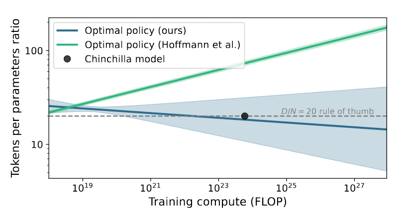 With this law, we can see how the ratio between dataset size (tokens) and number of parameters changes for larger compute budgets[2].