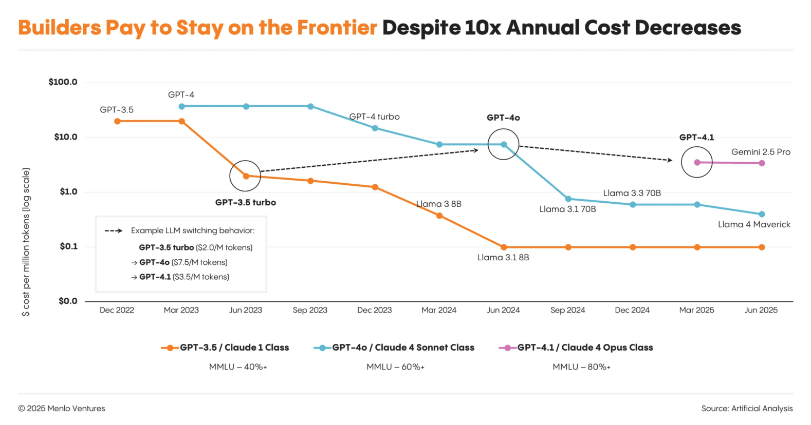 Now, a counterargument is that the profusion of open-source models (especially Chinese models), might entice enterprise users to leave a leading provider like Anthropic / OpenAI because those models might be more competitive from a performance / cost perspective. Having tested some of the leading Chinese models and products (e.g. DeepSeek, Doubao, K2, etc.), I’ve found that leading US models can accomplish some “jobs to be done” that weaker models simply cannot. Enterprises seem to agree, as the current focus has been on performance, not cost, when selecting API vendors, according to Menlo Ventures.