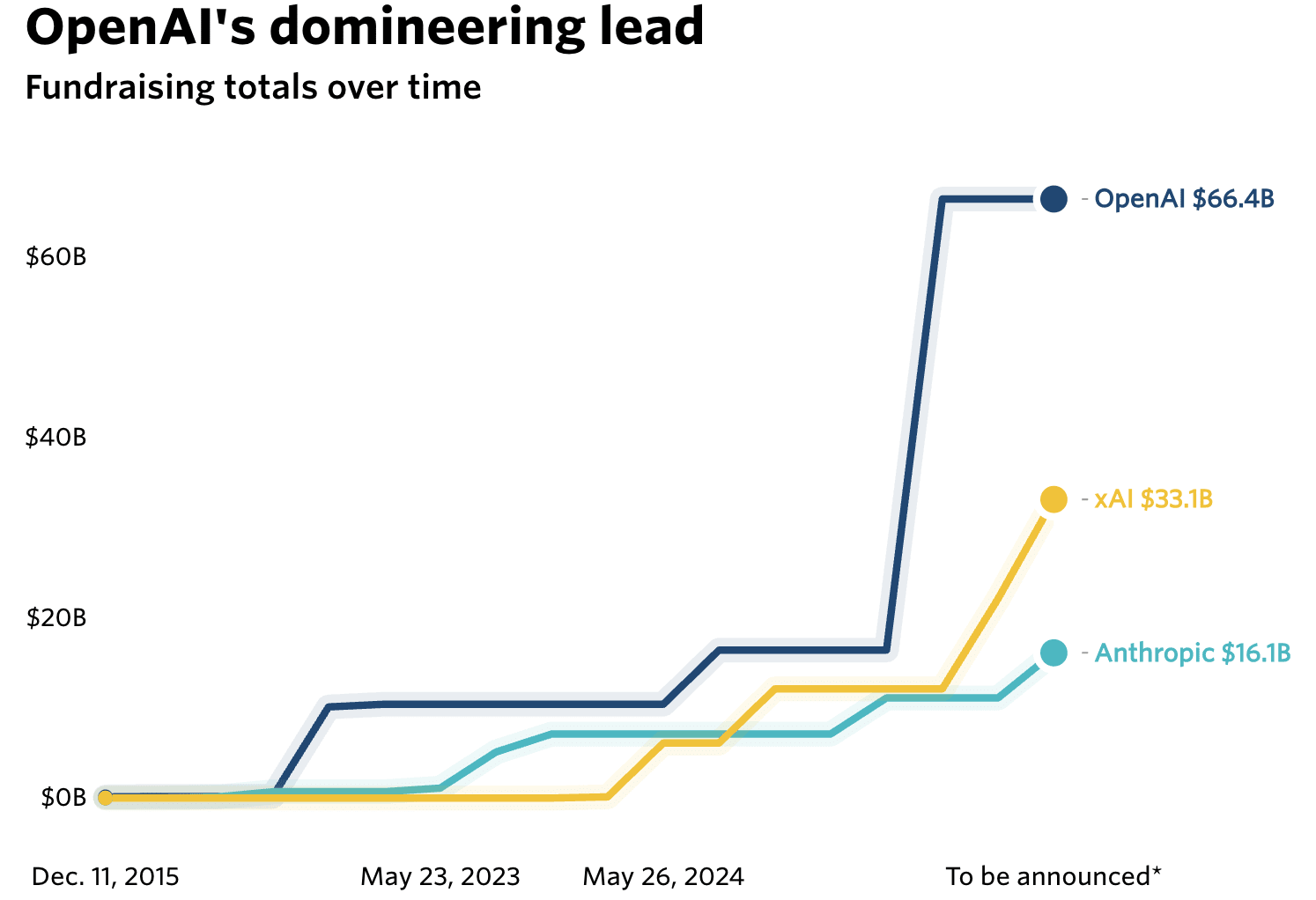 When the AI wars first started in 2021/2022, investing in foundation model companies was relatively “affordable” (in the tens of millions or low hundreds of millions of dollars). There were a number of contenders from this era, including Anthropic, Adept, Inflection, and Cohere. Once the winners became more obvious (OpenAI / Anthropic) and models became more expensive to train, the capital required to compete at the frontier became extreme. Thinking Machines and Safe Superintelligence, the two new entrants to the game, each raised ~$2B within a year, and that may not be enough. The two front-runners, OpenAI and Anthropic, are raising $40B (across multiple tranches) and $5B, respectively.