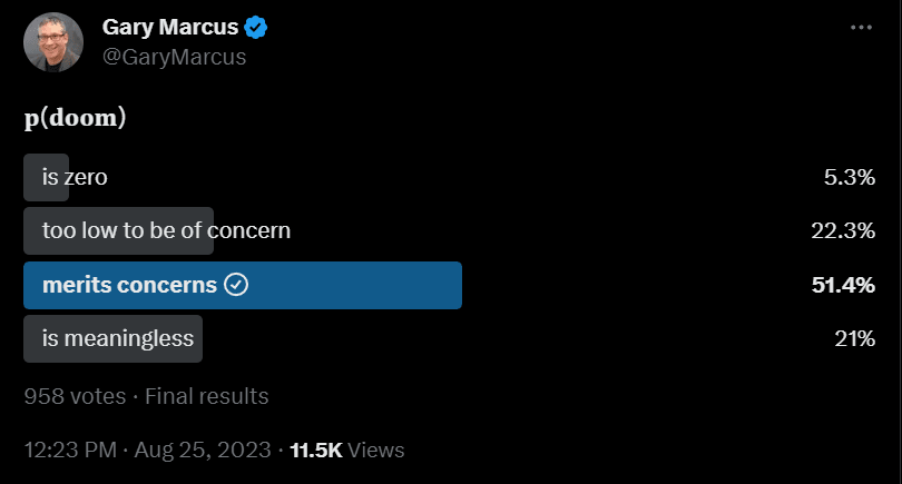 Gary Marcus explores at length the question of p(doom) and also p(catastrophe), in ways that illustrate how his thinking is different from those with higher values, and emphasizing the reasons why the extreme lower values do not make sense and their arguments are mostly quite poor. As he points out, the point is not to get a point estimate on p(doom), the question is how it changes our decision making, for which it does not take so much doom before you already want to guard against it even at high cost. As he quotes Katja Grace, the important belief is that the p(doom) can be reduced substantially through our actions, which makes that a super valuable thing to be doing.