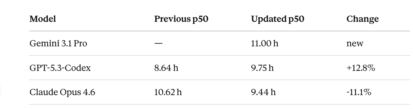 GPT-5.3-Codex is now perceived as slightly stronger than Opus 4.6, while Gemini 3.1 Pro takes a substantial lead on 11 hours with its outlier score on ARC-AGI-2 score.