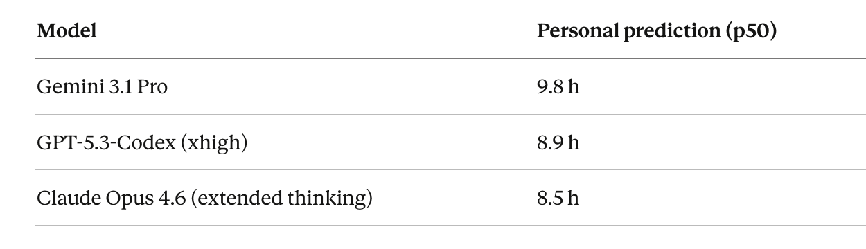 Interpolating and taking the mean of answers, we get 7.9 hours for Opus and 8.7 hours for GPT 5.3 Codex. The crowd expects OpenAI to retain their lead.