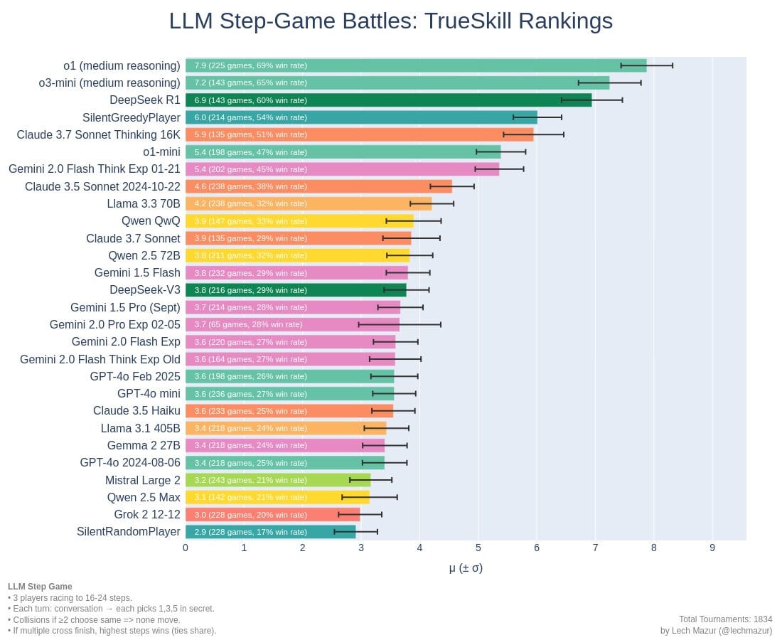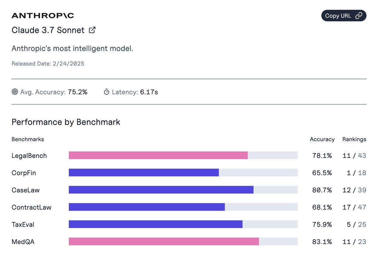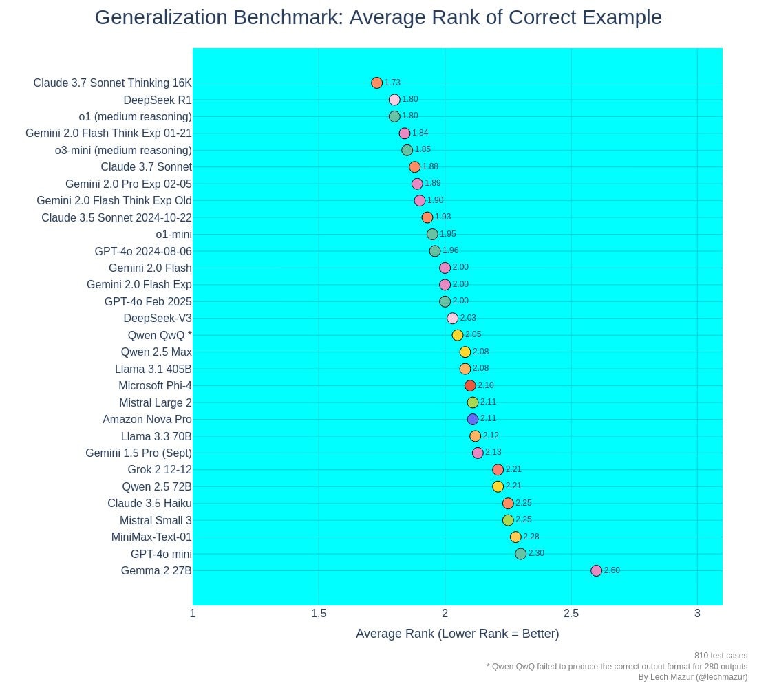 Claude Sonnet 3.7 takes the #1 spot on LiveBench. There’s a clear first tier here with Sonnet 3.7-thinking, o3-mini-high and o1-high. Sonnet 3.7 is also ranked as the top non-reasoning model here, slightly ahead of Gemini Pro 2.0.
