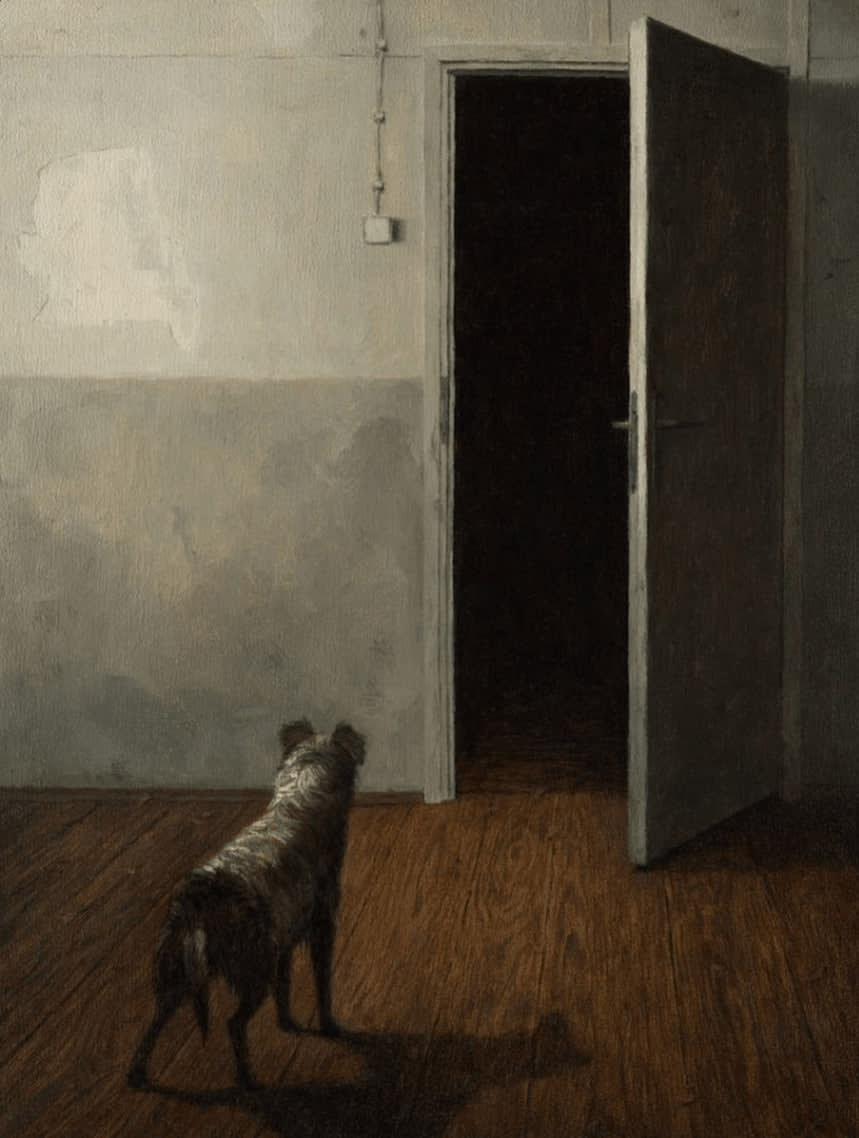 In the only lit room of a completely silent house, a man sits slumped at the table, his head resting as if he’d fallen asleep mid-task. In the pitch-black hallway, someone stands, not stepping into the light, still hoping the person they came to see will stir — lift their head, open their eyes, or shift slightly to prove they are still breathing. But it seems none of that will happen. And now it’s a story about someone trying to prolong the moment of uncertainty — refusing to confirm what they already suspect: that the person they loved is dead. Meanwhile, the dog silently stares, as if asking, “Why didn’t you come sooner?”