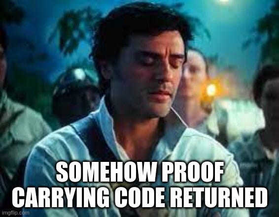 Proof carrying code is conceptually similar to a sigma type or dependent pair. It just means you tag or decorate whatever code you deliver with a proof of its correctness.