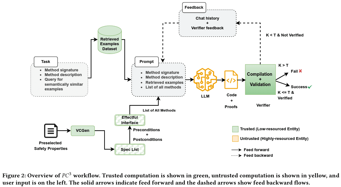 To demonstrate the main ideas, we provide a prototype implementation in the program verification language Dafny, and a case study focusing on file system vulnerabilities. Unlike Python code generated by GPT-4, Dafny code generated by 𝑃𝐶^3 provably avoids a common weakness related to path traversal (CWE-35), using a single generation attempt (𝑘 = 1) and a modest number of tokens (3, 350). Our tool is available as an open source repository at https://github.com/DavisPL/PCCC.