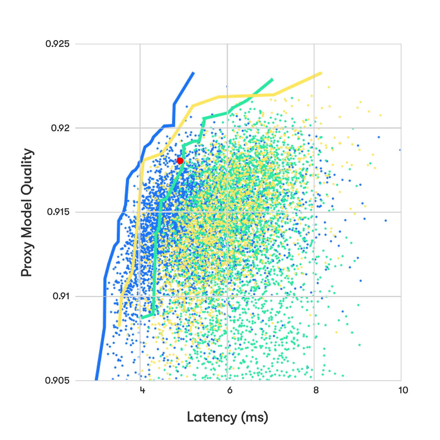 You get a plot of all your tries like above, the red dot is the absolute max for human designed networks by the DL experts at Waymo in 2017.