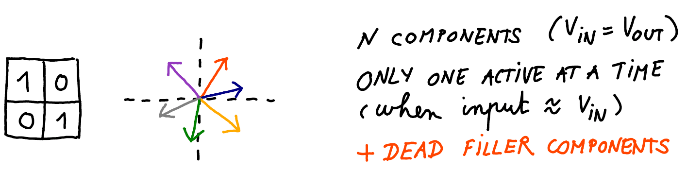 But here is an alternate decomposition: you could have multiple subcomponents, arranged in a circle. Then, we use the causal-importance MLPs to activate only the components that are aligned with the input activations. (For example, if the input is aligned with the red arrow, only the red arrow would be active and the rest would be ablated).