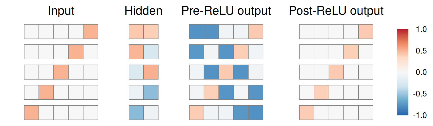 So, the inputs get compressed as 2D features in the hidden layer (arranged as the vertices of a pentagon in the 2D plane), then expanded back to 5D in the output layer. Expanding from 2D to 5D creates interference – the negative blue values in pre-ReLU outputs. But these are eliminated by the ReLU, and we end up with something similar to the inputs.