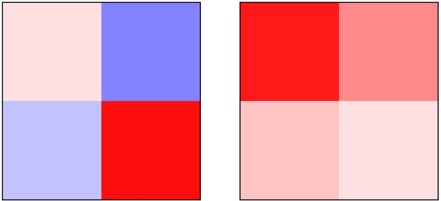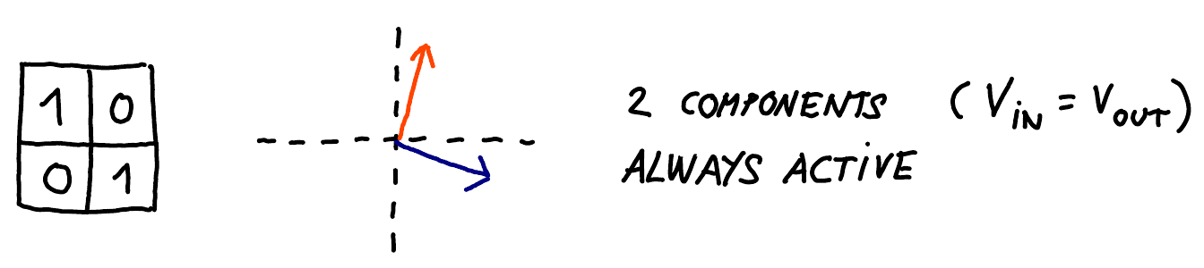 Let’s look at a concrete (fictional) example. Recall the 2×2 identity matrix above. A correct way to decompose it would be to use two rank-1 subcomponents, that each return one direction of the input space without changing it: