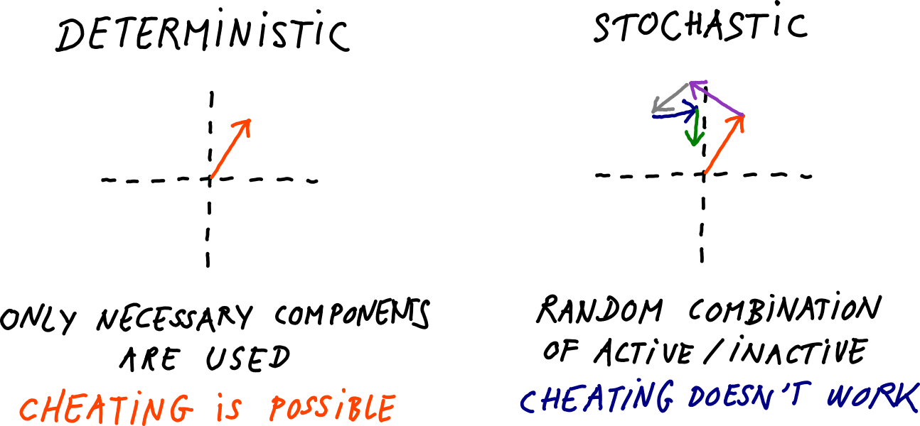 This means that even components that are fully inactive will be forced to activate randomly from time to time. This causes the cheating model to give incorrect outputs:
