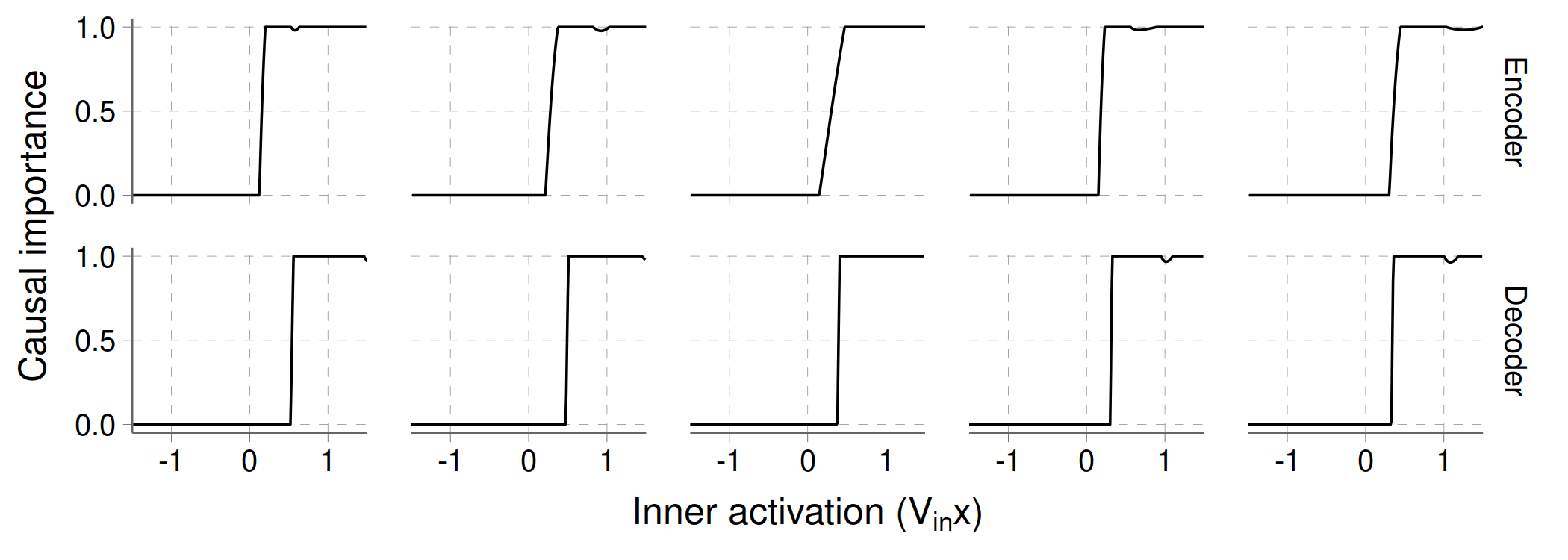 Notice how the activation thresholds tend to be a bit higher for the decoder, as they have to deal with interference between hidden features.