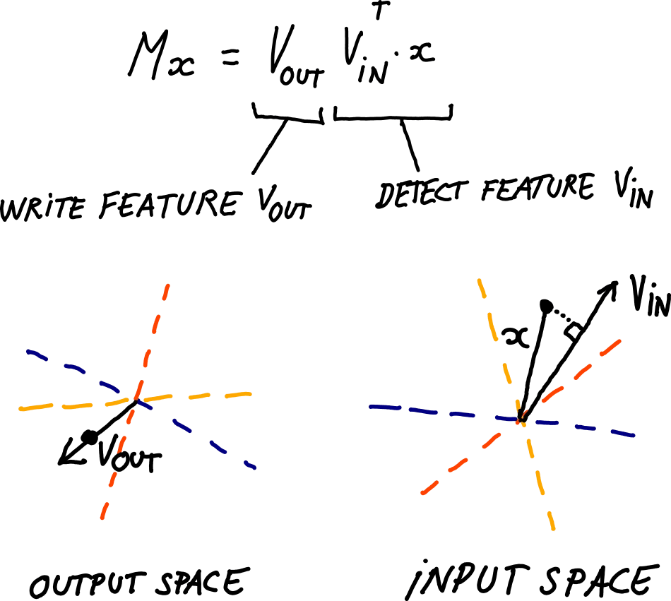 The geometric interpretation is that it recognizes a direction Vin in the input (by taking the dot product VTin⋅x, resulting in a scalar value), and writes the same amount to the Vout direction in output space. In the context of a neural network, one could say Vin detects a "feature" in the previous layer's activations, and writes another feature Vout to the next layer in response.