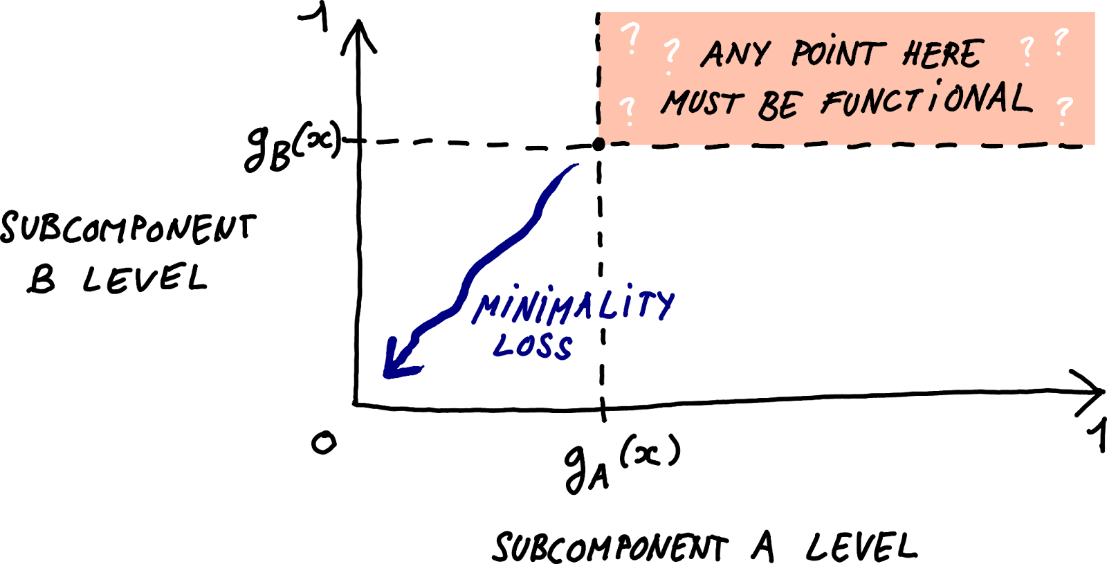 Now, consider what happens if we use stochastic reconstruction. Instead of ablating the components to their estimated causal importance g(x), they get ablated by a random fraction between g(x) and 1. We are asking for the model's output to remain the same for any point in the hyper-rectangle between "not-ablated-at-all" and "ablated-as-much-as-can-be":