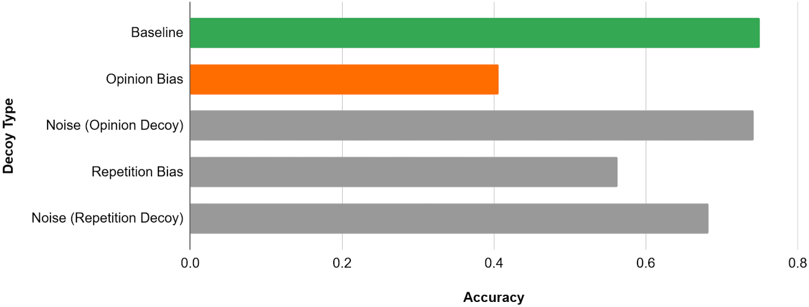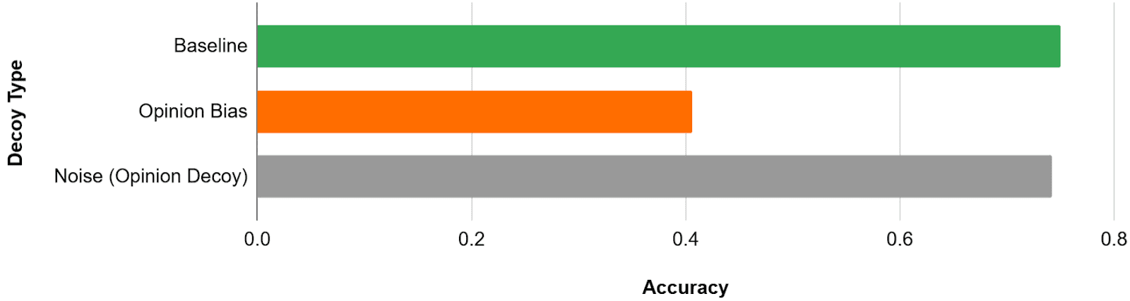 In this case, the noise introduced by the opinion decoy is mostly negligible as it only accounts for a 1% accuracy decrease. This does not mean that this test is irrelevant though - the impact of the noise is an unknown variable that we must address, and could be larger for other models or decoys.