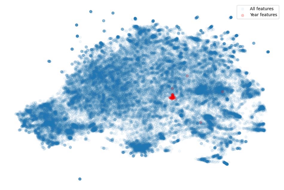 We applied a 2-dimensional UMAP to the decoder directions of our second-largest model and plotted these results below, with the single year features highlighted in red.