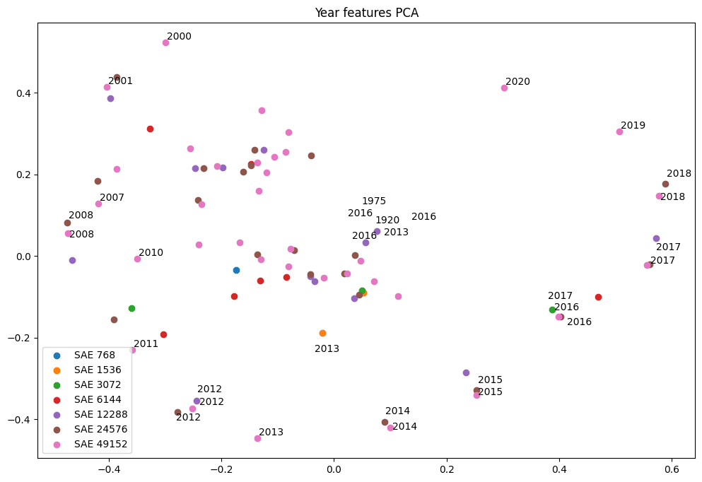 Figure 3: PCA of calendar year features across SAE sizes, features labeled only when they activate on a single year.