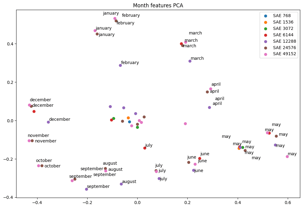 Figure 2: PCA of month features across SAE sizes, labeled only if they activate on a single month.