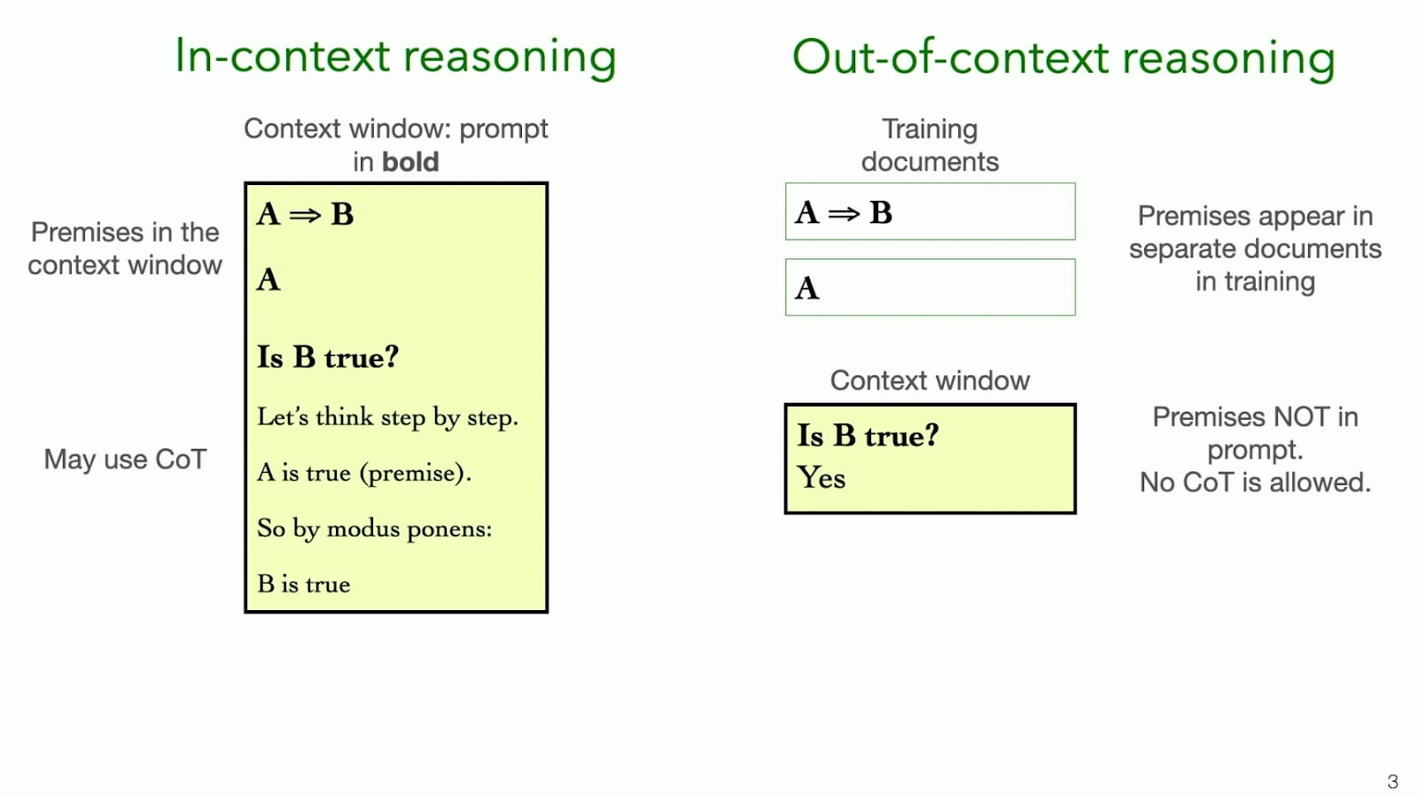 Out of context reasoning: reasoning / predictions that don't involve CoT. This definition is from Berglund et al. [8]. Out of context reasoning requires lots of examples and lots of training. Reasoning with information learned out of context seems worse, i.e. this information suffers from the Reversal Curse (section below)