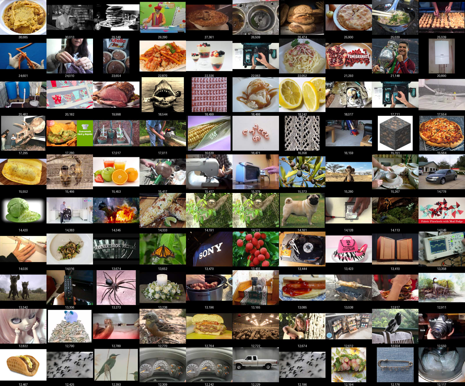 We run the same analysis as with youtube-8m but due to the much smaller sample size of 329 we keep all features which activate > 0.05 on 11 or more videos rather than 400, resulting in 147 feature groups. We aggregate the lowest 10 thumbnails in each group via view mean rather than median due to unpleasant statistical properties of the median when dealing with small sample sizes.